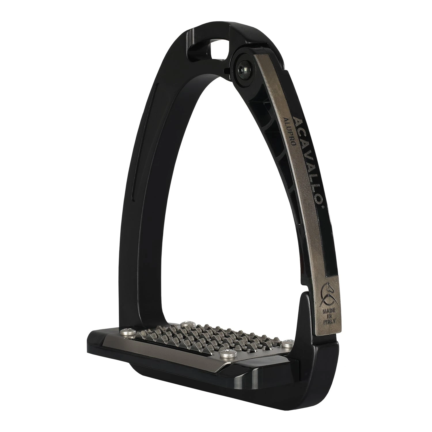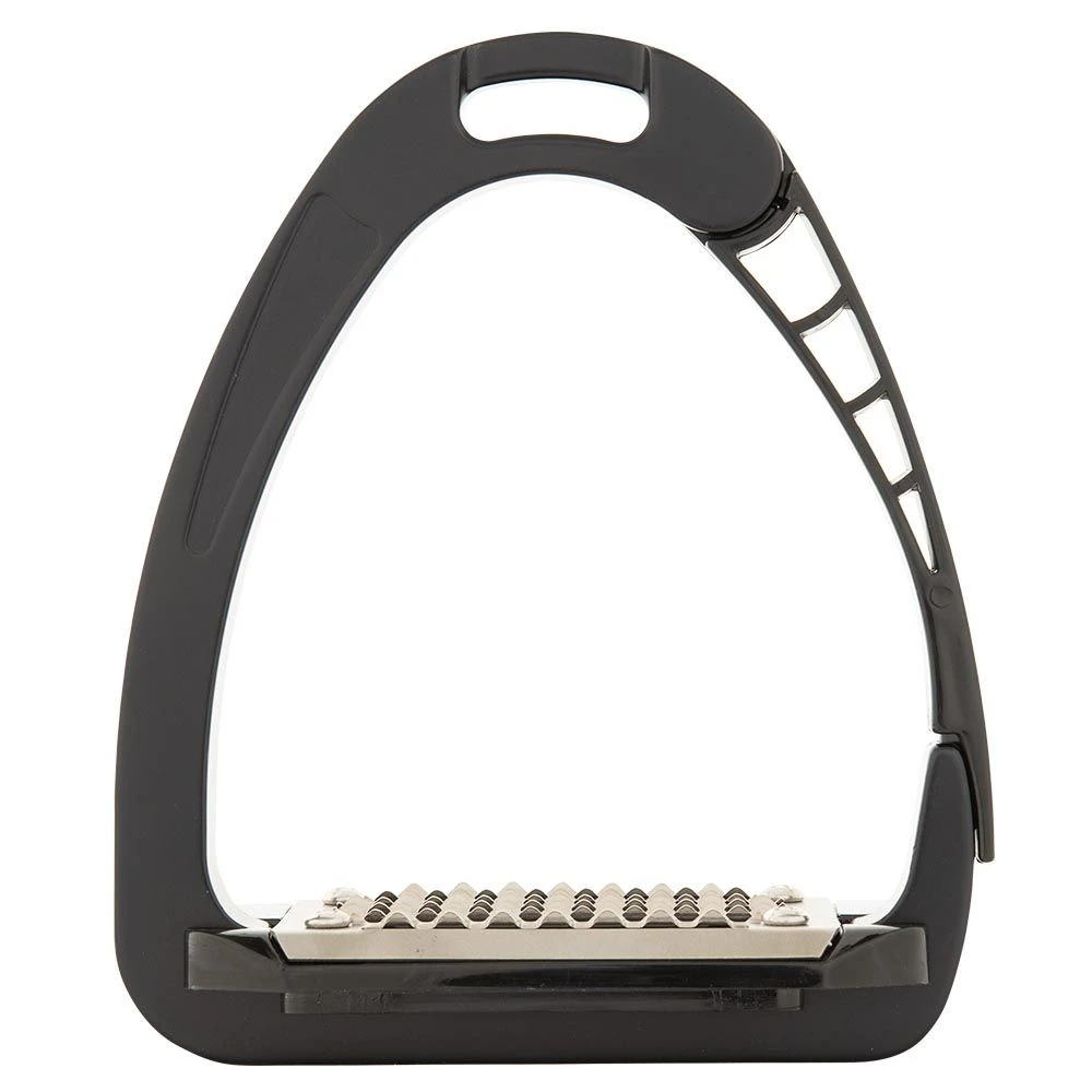 The stirrup bow is made of aluminum, while the opening arm is made of a special polyamide material. The stirrup pad is made of polyamide, too, and the tread is fabricated from stainless steel. The “AluPro” model, in principle, provides the same safety function as the Arena “HiFlex”, but it is based on different materials.