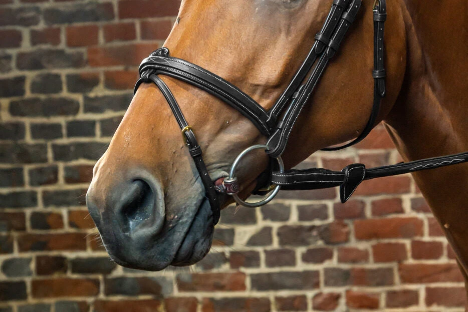 Flash noseband from the Dyon Collection line. The noseband has fancy cream stitching and comes with brass buckles.