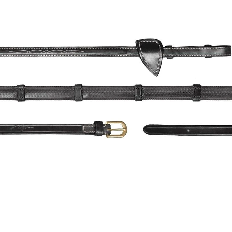 These reins from the Dyon Collection fit perfectly to the bridles from the same Dyon Collection. The reins have a fancy cream stitching and brass buckles. These are the Rubber reins with leather stoppers.