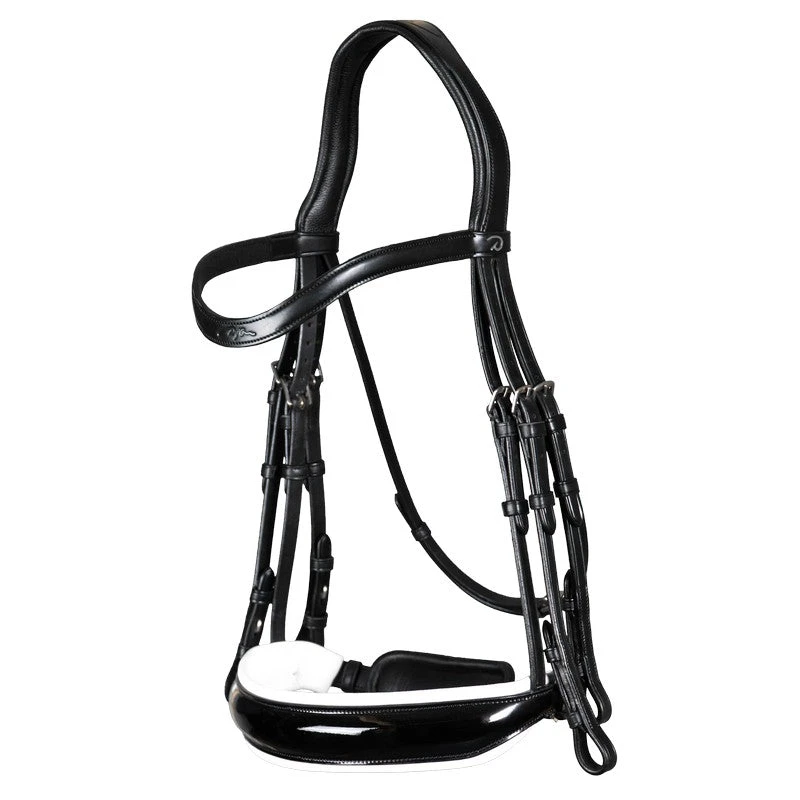 Double bridle from the top brand Dy’on. This bridle has a large patent crank noseband of 38mm wide. This is wonderfully flexible and anatomically shaped. The pull-back part rests on a soft padding for extra comfort for your horse. The noseband is patent leather with a white lining. The headpiece has an anatomical S-shape so that the ears lie nicely free.