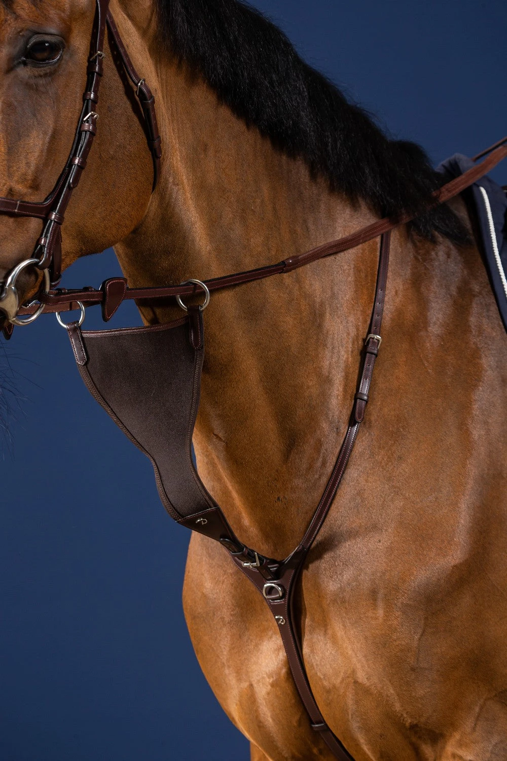 Elastic and closed martingale attachement with tone in tone colored stitching from the top brand Dy’on. The martingale attachement is fitted with silver-coloured stainless steel buckles. Thanks to the roller buckle, the fork can be easily attached to a martingale or breastplate and can be shortened or lengthened.