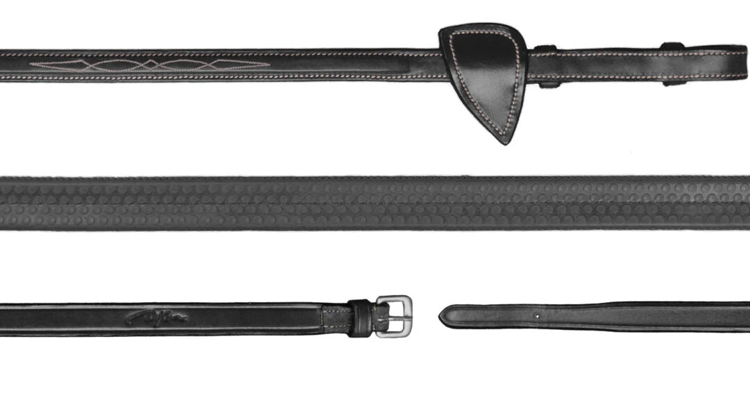 Wide rubber reins from Dy’on. These reins fit exactly with the bridles from the Dy’on US Collection line. These are the small rubber reins. The reins have a stainless steel buckle and a hook closure at the bit. The reins have stainless steel buckles and a fancy cream stitching.