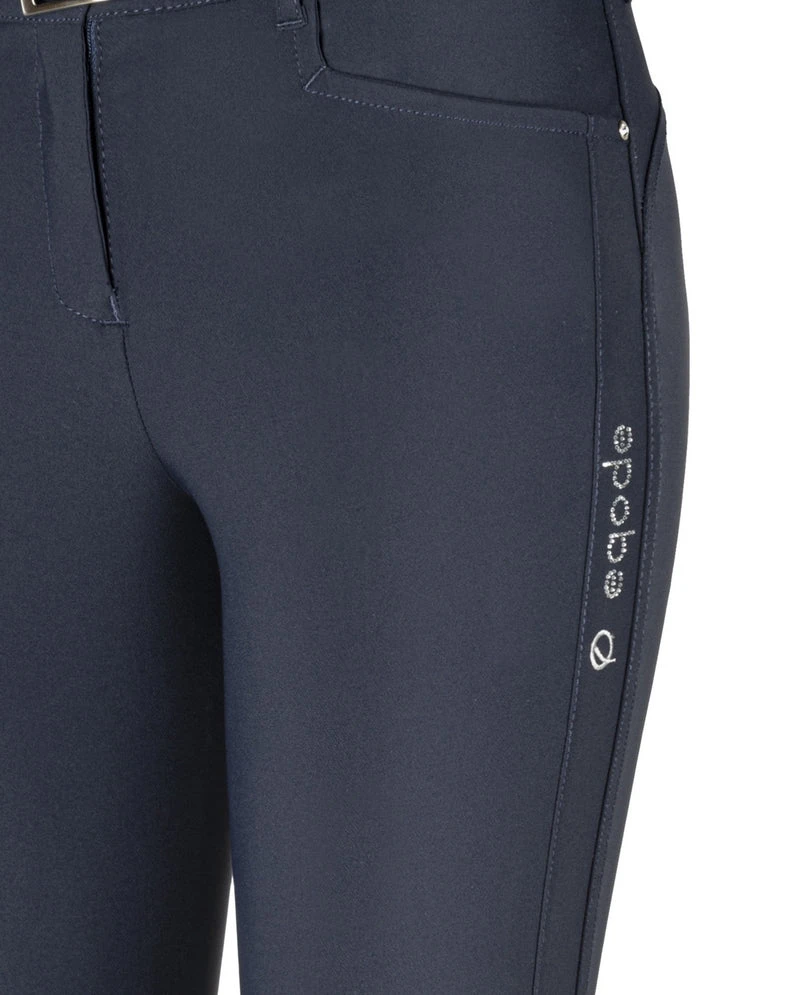 Comfortable Limited Edition breeches from the Eqode Collection. These fashionable ladies breeches are made of a stretchy and very comfortable fabric. The breeches have Q knee grip for extra fine grip. There are 2 side pockets on the front. Elastic leg closure at bottom with Eqode text logo in contrast color. On the left leg is the eqode logo in glitter stones and two crystal buttons at the front pockets complete your look