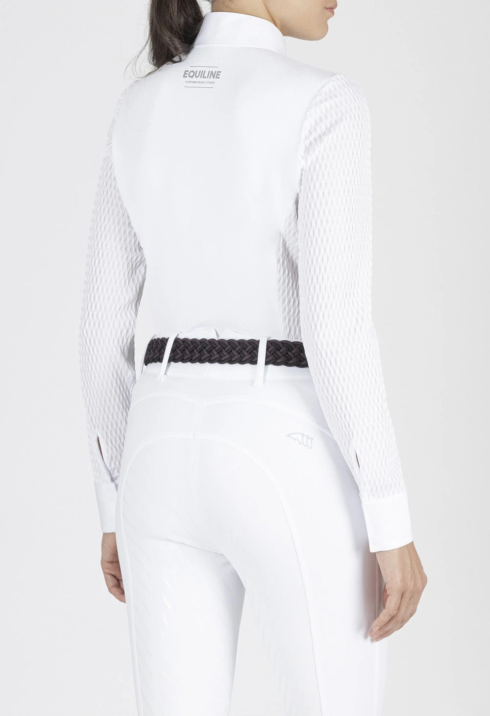 This Catic with long sleeves from Equiline is a sporty shirt but still with a chic touch. The fabric is soft and quickly wicks away perspiration. The sleeves are made of a wrinkled fabric that Equiline often uses in competition shirts and is very popular with our customers.