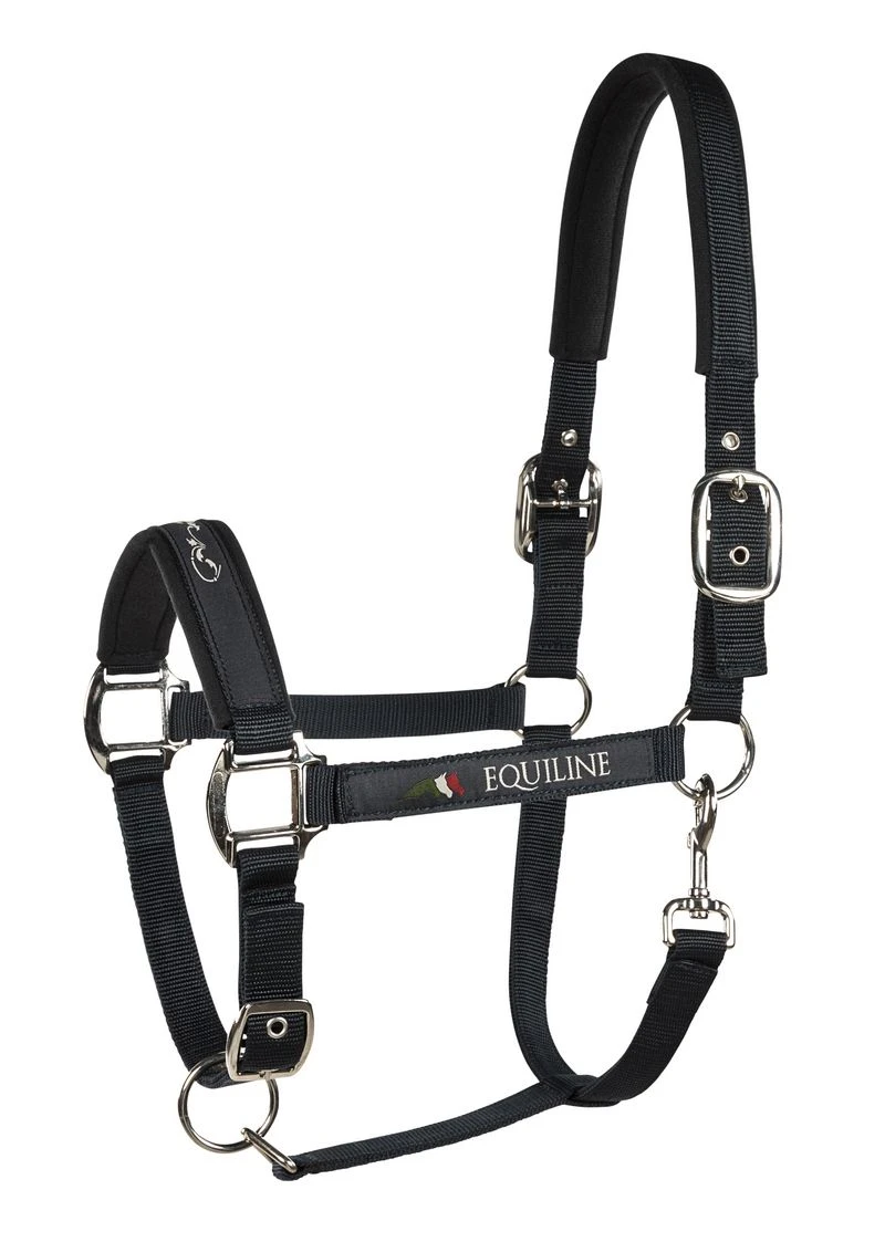 Adjustable Equiline polypropylene halter with soft neoprene lining. Carabiner and satin metal rings.