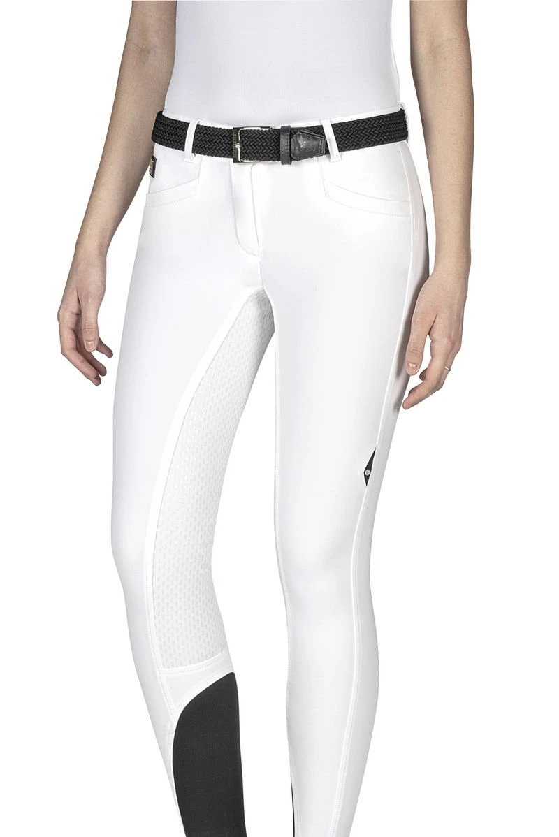 Woman breeches from Equiline with X-Grip full seat. They provide the highest stability on the saddle thanks to the new grip control technology granting the maximum comfort and freedom of motion. The Waist-Block system grants an optimal fitting on the Waist. The stretch fastening system on the bottom provides a perfect adherence of the breeches on the leg without the necessity of the Velcro regulation.