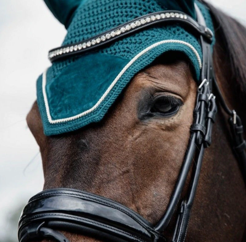 The Fly Veil Wellington velvet is a combination of the extremely popular American look, velvet details and Kentucky Horsewear’s expertise. This fly veil is hand knitted for better durability, finished with fancy velvet details. The Fly Veil velvet protects the horse’s ears against flies while riding. The material around the ears is stretch and slim fit. The neck part is longer so it can’t slip.