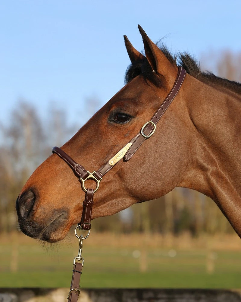 The Leather Grooming Halter is made of artificial leather (100% animal friendly). This artificial leather does not absorb water or dirt, does not break, doesn’t get hard or change colour. It’s more flexible than real leather and therefore much nicer to use. Because it doesn’t absorb water this grooming halter is perfect for washing horses. The Grooming Halter doesn’t have a throat latch which makes it easy to put on and take off. Many top show grooms prefer a grooming halter without throat latch in the grooming box. The nose piece is made of rolled artificial leather. The size can be adjusted under the chin and on the left side of the head. The Grooming Halter features a gold coloured plate with our engraved logo. It can be turned over and personalized. All closures are gold coloured and are therefore a perfect match with are leads. The Grooming Halter can be cleaned with our Kentucky Horsewear Tack Cleaner. It was specially developed to clean our artificial leather. Very easy and efficient! Do not clean with glycerine soap.