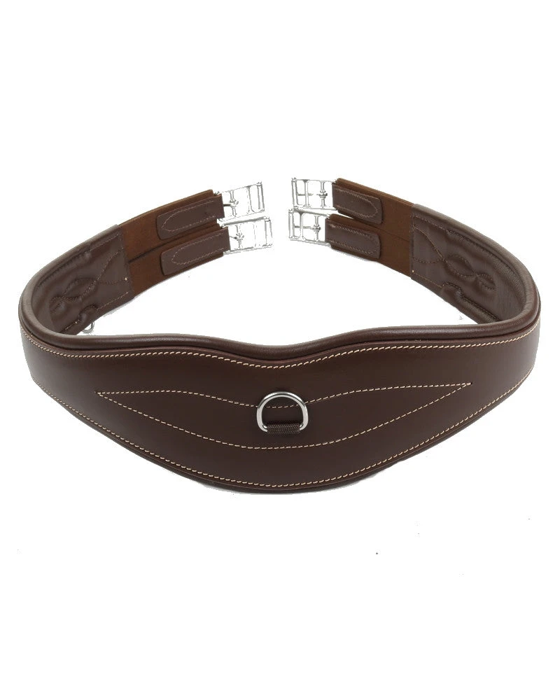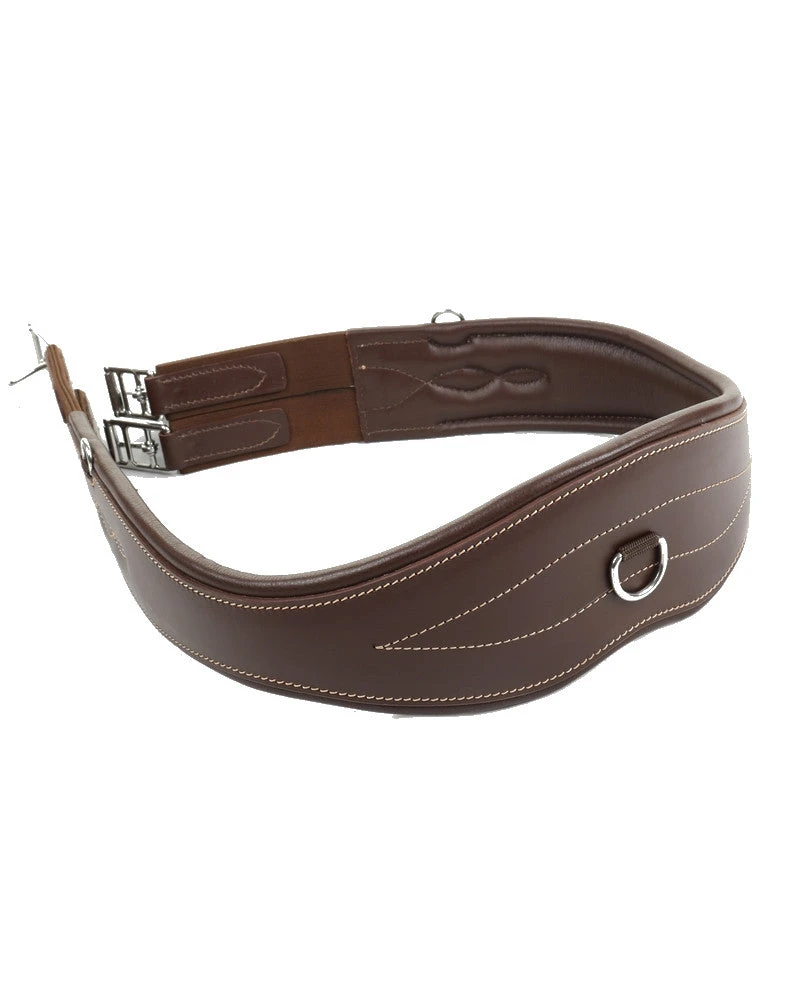 Anatomically shaped leather girth with soft lining and finished with decorative stitching. The roller buckles are attached on both sides to 3-fold elastic. This girth has 3 d-rings for attaching martingale or auxiliary reins.