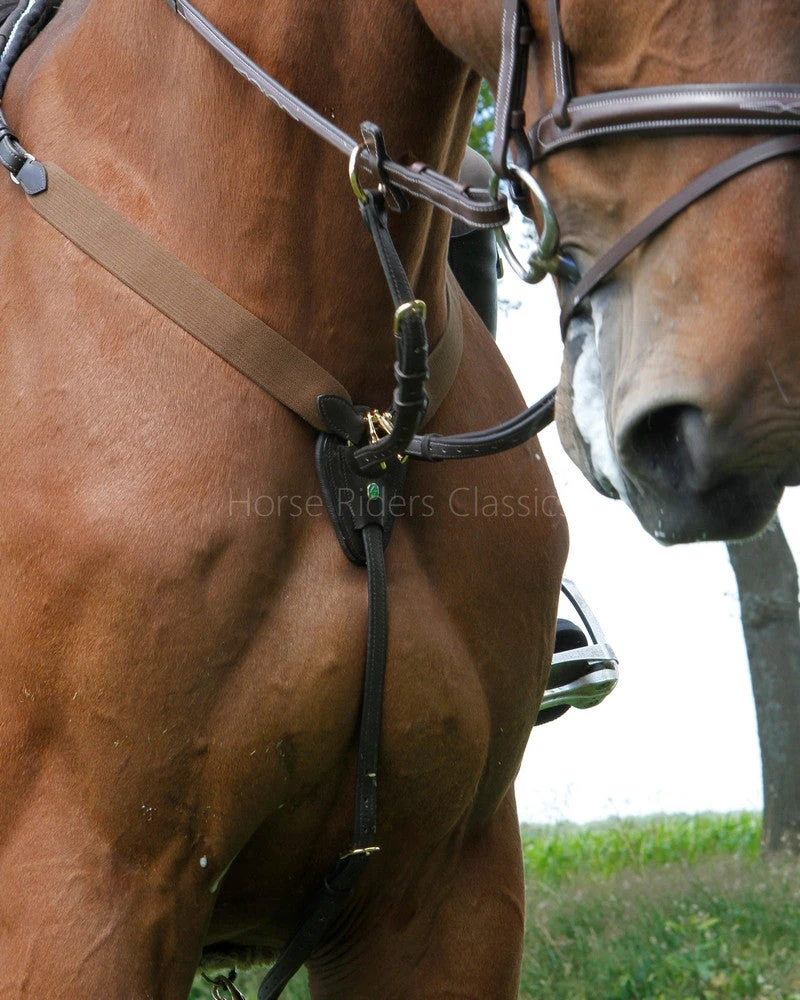 Soft but still very strong New Pro breastplate with 3 points system from LJ Leathers. The breastplate is made of buffalo leather in combination with a strong elastic and is suited for as well showing as well training at home. This item is attached to the girth and the buckles on both sides the saddle.