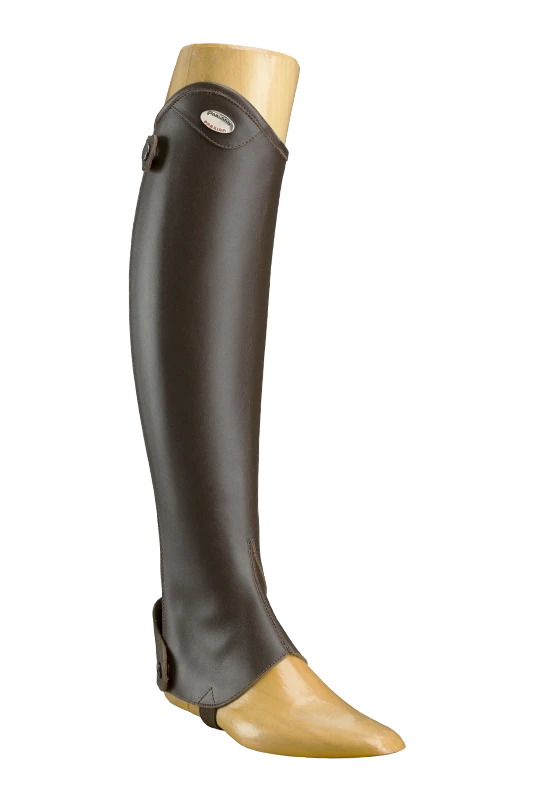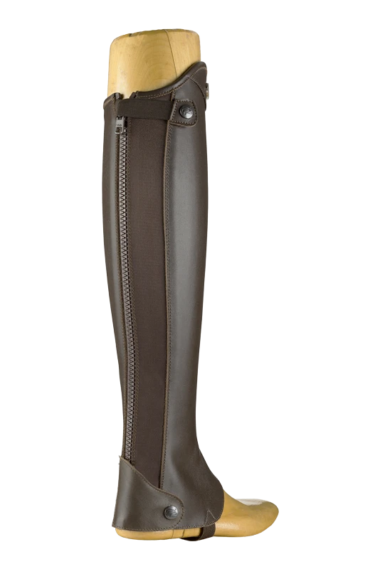 Parlanti Passion Half Chaps calfskin. Parlanti Passion Mini Chaps are the ultimate in performance and protection. These chaps are made of black genuine calfskin. Five calf sizes and two height options will provide an impeccable fit. Designed to perform in tandem with our Ankle Boots, they will give you the feel of custom made boots. These chaps offer you: Superior quality calfskin leather. No lining on inside. Back elastic insert. Back zipper. Parlanti Passion metal logo.