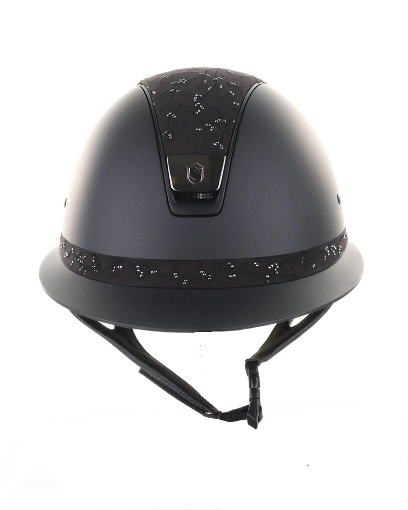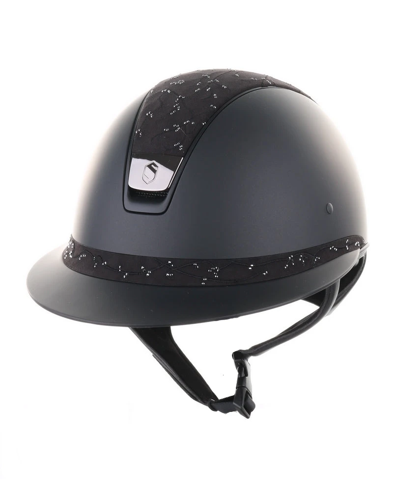 Inspired by women classic riding helmets the Miss Shield Shadowmatt is equipped with a long visor and a customizable frontal band.