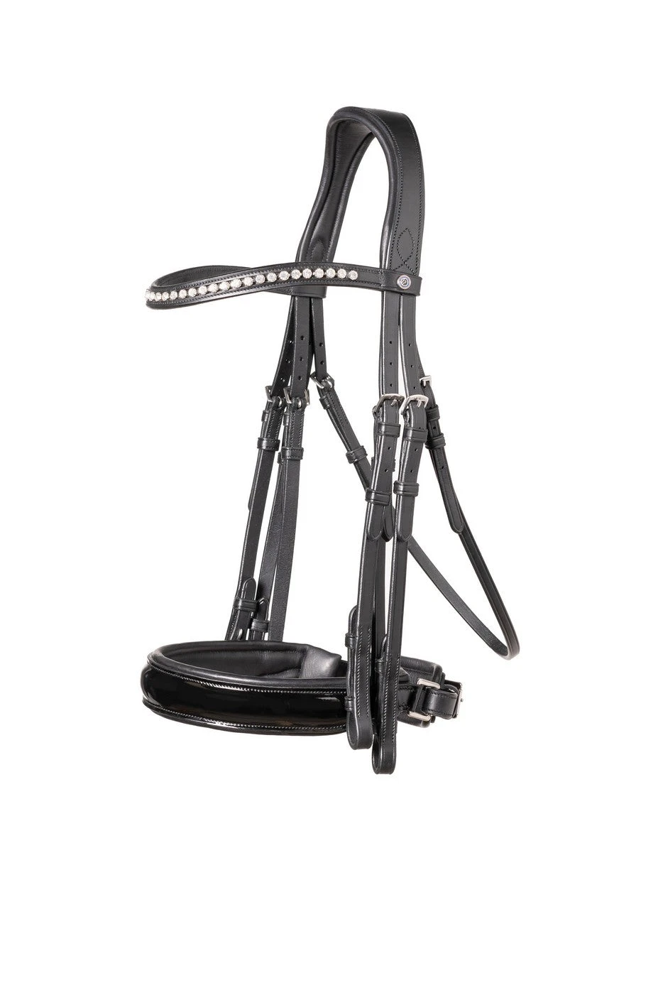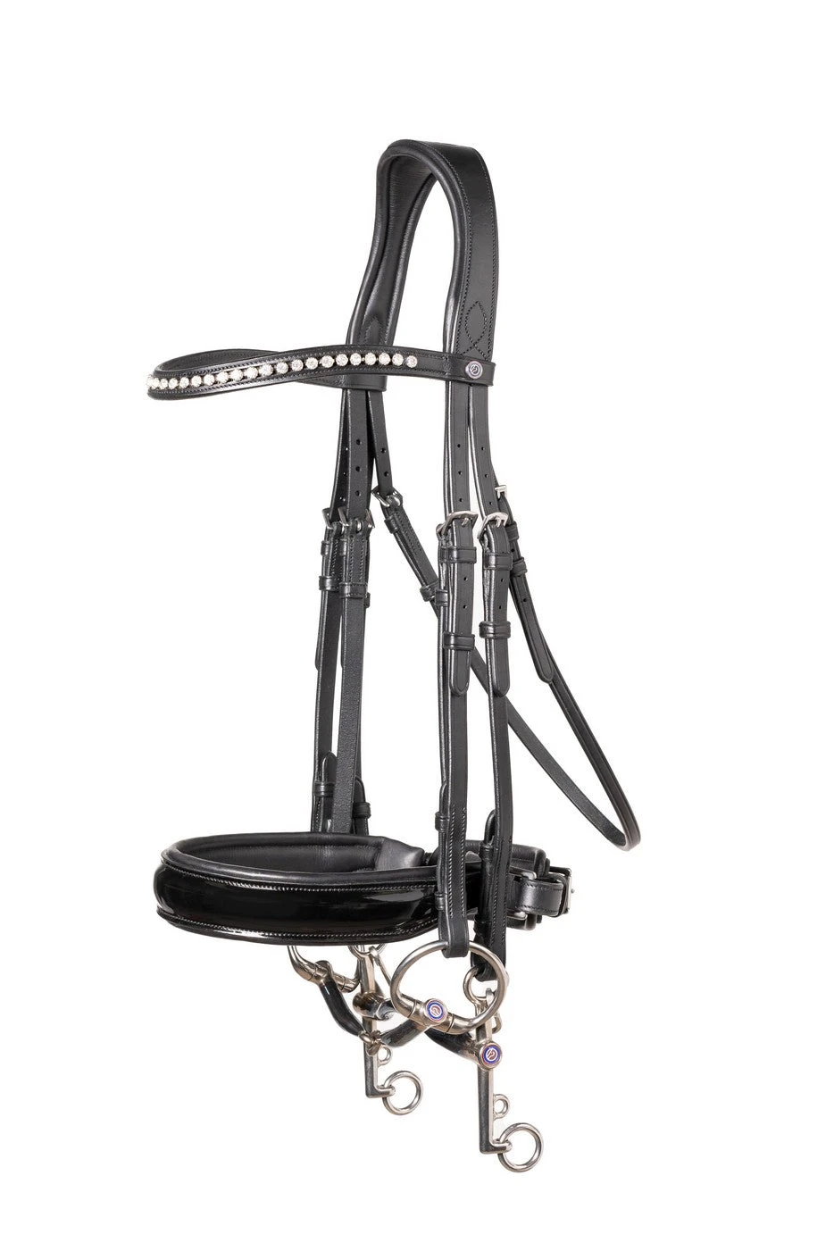 The double bridle TRUST Aachen is in a class of its own. The stylish bridle has a beautiful finish and a nice fit. The TRUST Aachen has a patent leather and anatomic crank noseband that is reinforced with nylon to prevent stretching. The noseband padding extends beyond the noseband so that the buckles can never touch the horse’s head. The browband is fitted with the purest quality Stelluxâ„¢ stones, which gives it an elegant look. These stones are deep-set, so they do not fall out. The headpiece is anatomically shaped and cut back for more freedom at the ears. The padding of the headpiece is soft but not too thick, so that there is direct contact with the horse. The TRUST Aachen is a must-have bridle for the dressage rider!