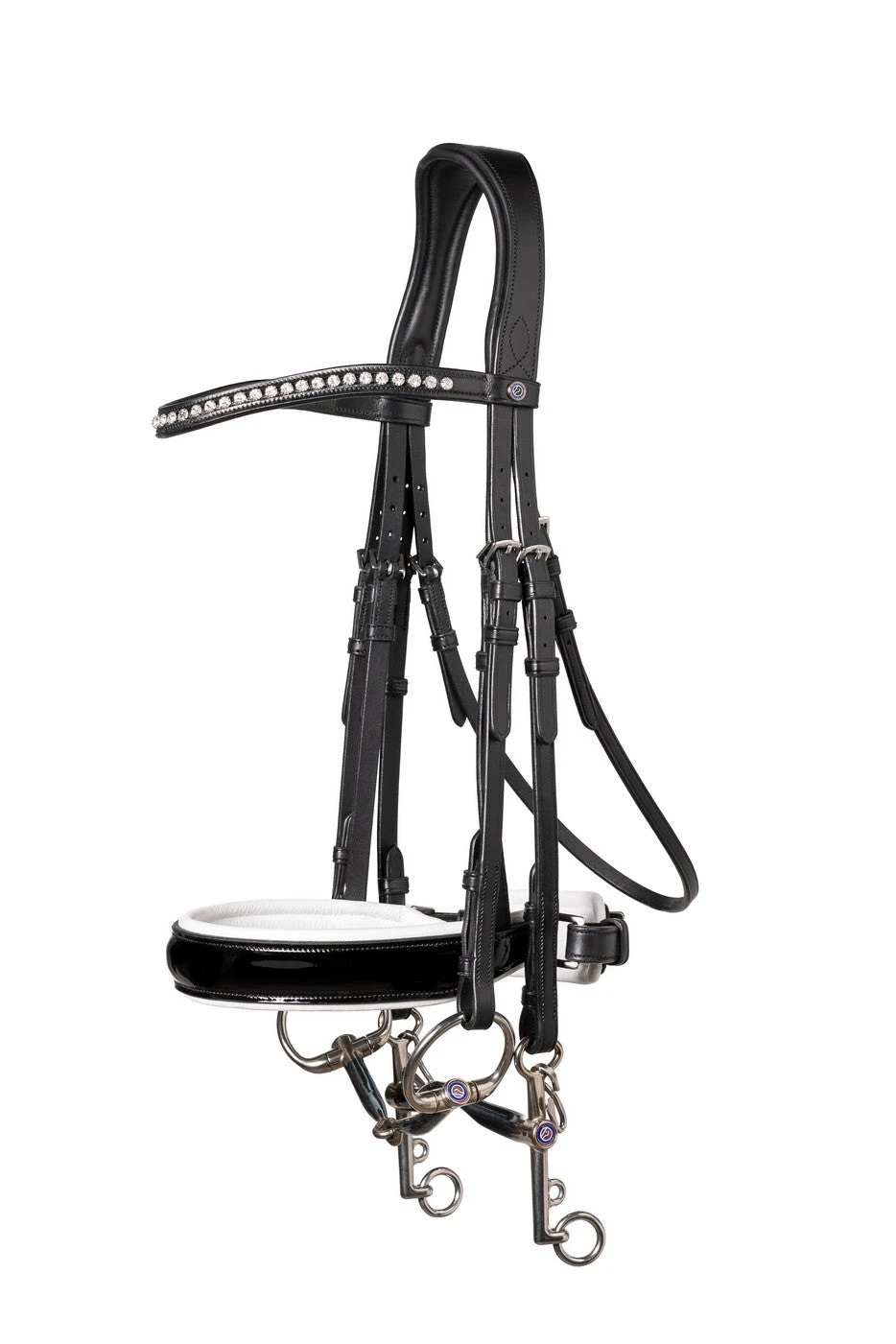 The bar and snaffle bridle TRUST Aachen is in a class of its own. The stylish bridle has a beautiful finish and a nice fit. The TRUST Aachen has a patent leather and anatomic crank noseband that is reinforced with nylon to prevent stretching. The noseband padding extends beyond the noseband so that the buckles can never touch the horse’s head. The browband is fitted with the purest quality Stelluxâ„¢ stones, which gives it an elegant look. These stones are deep-set, so they do not fall out. The headpiece is anatomically shaped and cut back for more freedom at the ears. The padding of the headpiece is soft but not too thick, so that there is direct contact with the horse. The TRUST Aachen is a must-have bridle for the dressage rider!