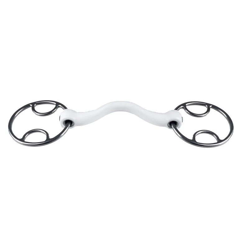 This bit has two half rings in the cheekpiece which gives more control than normal rings. The beval has several options for attaching the reins so you can decide how much pressure you want to apply. The cheekpiece is attached to the upper half ring and the reins can be attached to the large ring or to the lower half ring. By attaching the reins to the large ring, pressure is applied to lower the head. When the reins are attached to the lower half ring, the bit has a light leverage for better responsiveness.