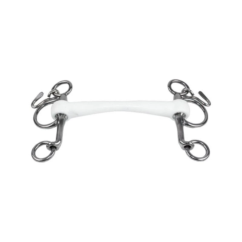 The pelham cheekpiece combines the effect of a snaffle and a double bridle. The bit has one cheekpiece but can be ridden with one or two reins. If you choose to ride with one rein, a pelham strap is needed to connect the bit rings to the rings of the shanks. The longer the shanks, the sharper the effect. The baby pelham has short shanks and therefore is less sharp than the normal pelham. A pelham bit is mainly used with strong horses, horses with too little space in the mouth for two mouthpieces or horses that have to get used to a double bridle. This bit is not suitable for the inexperienced rider.
