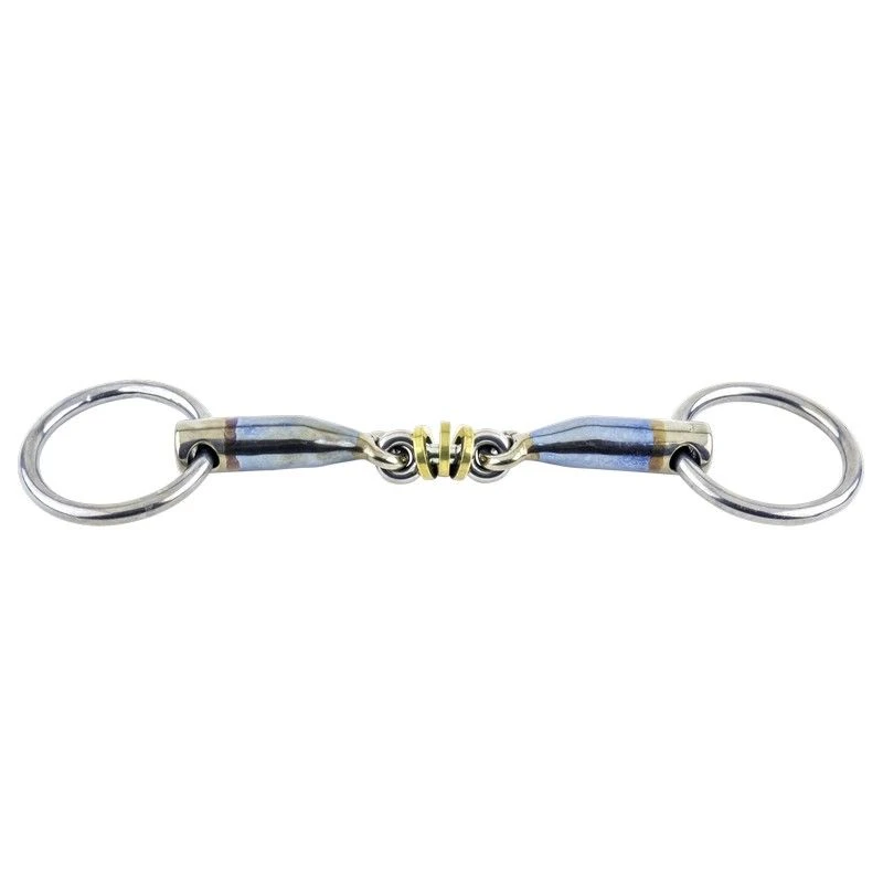 The mouthpiece with rings is a variant of the double-jointed bit. The rings in the middle stimulate the horse to play with the bit. This increases the tongue activity so that the horse will produce more saliva and the jaws can relax more.