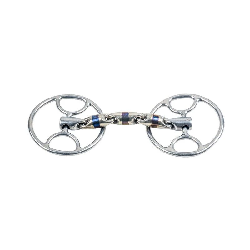 This bit has two half rings which are connected with eachother and therefore has limited freedom of movement. This bit gives more control than normal rings. The swivel cheekpiece has several options for attaching the reins so you can decide for yourself how much pressure you want to apply. The cheekpiece is attached to the upper half ring and the reins can be attached to the large ring or to the lower half ring. By attaching the reins to the large ring, pressure is applied to lower the horse’s head. When the reins are attached to the lower half ring, the bit has a mild leverage for better responsiveness.