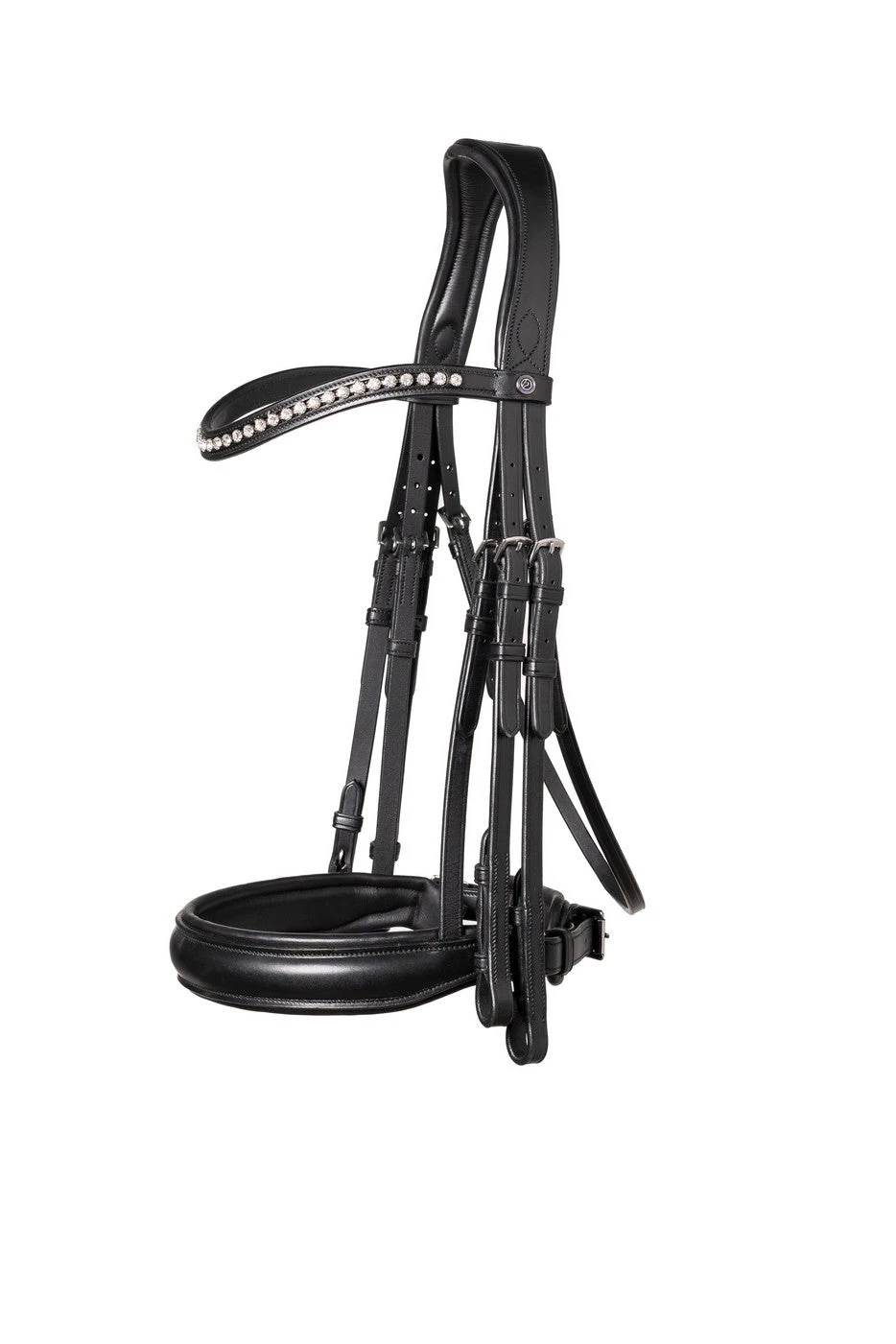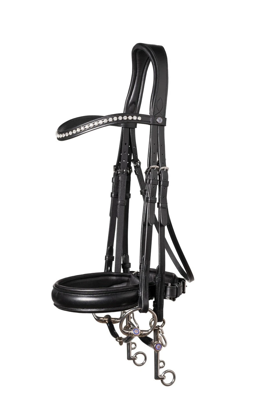 The Double bridle TRUST Wellington is in a class of its own. The stylish bridle has a beautiful finish and a nice fit. The TRUST Wellington has an anatomical crank noseband that is reinforced with nylon to prevent stretching. The noseband padding extends beyond the noseband so that the buckles can never touch the horse’s head. The browband is fitted with the purest quality Stelluxâ„¢ stones, which gives it an elegant look. These stones are deep-set, so they do not fall out. The headpiece is anatomically shaped and cut back for more freedom at the ears. The padding of the headpiece is soft but not too thick, so that there is direct contact with the horse. The TRUST Wellington is a must-have bridle for the dressage rider!