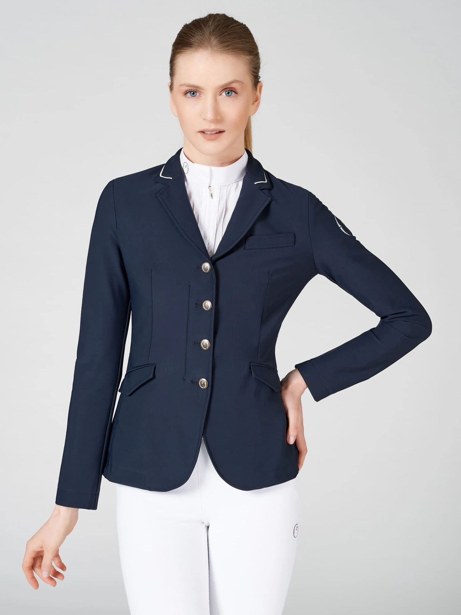 Canberra jacket in a lighter version, ideal for the spring summer season. Unlined women’s competition jacket, Canberra is a high-end classic one. The light knitted fabric is ideal for the warmer seasons and perfect for competitions. At the same time, it’s soft enough to guarantee freedom of movement for every body shape, including curvy ones. Contrast alcantara details, personalized rib recalling the Stable’s colors. Laser logo on shoulder. All materials are durable and strong.
